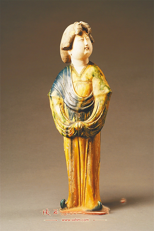 俑是古代丧葬风俗中常见的随葬明器之一,虽然孔子说“始作俑者,其无后乎”,但俑代替了早期残忍野蛮的人殉制度,确实是丧葬风俗的一种进步。随着人俑造型的发展,其逐步成为中国古代雕塑艺术中的重要组成部分。蜚声中外的唐三彩中,人俑造型就占了相当大的一部分,这其中尤以体态丰满的仕女俑等最具盛唐气象。以陕西历史博物馆所藏的一件唐三彩女立俑来看,女俑的面庞丰腴,长眉细眼,直鼻,樱桃小口微抿,下颌微抬,头部微微抬起望向远方。优雅的身姿、腴美的体态与落地的轻薄衣裙相得益彰,仕女俑整体呈现出自然流畅的线条美,轻松自然的表情与沉稳娴雅的举止也再现了唐代女性的柔美端庄和风雅高贵。