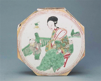 从故宫博物院所藏的一件清康熙五彩仕女瓷板来看,正面绘以五彩仕女婴戏图,画面中的仕女持扇端坐,形体优雅,面部轮廓描绘细致,在画面中显得高大端庄;一小童站于仕女背后,另一小童站在一旁,嬉戏玩耍。背后的栏杆山石写实入微,整体的生活气息浓郁,充满着母慈子爱的美好意境。