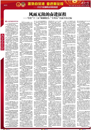 | 海南日报 蓬勃自贸港 奋进新征程——2021全国两会特别报道 003 2021-03-081 2021年03月08日 星期一 |
