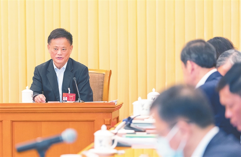 3月9日,出席十三届全国人大四次会议的海南代表团在住地举行会议,审议全国人大常委会工作报告和“两高”工作报告。图为许俊代表在发言。