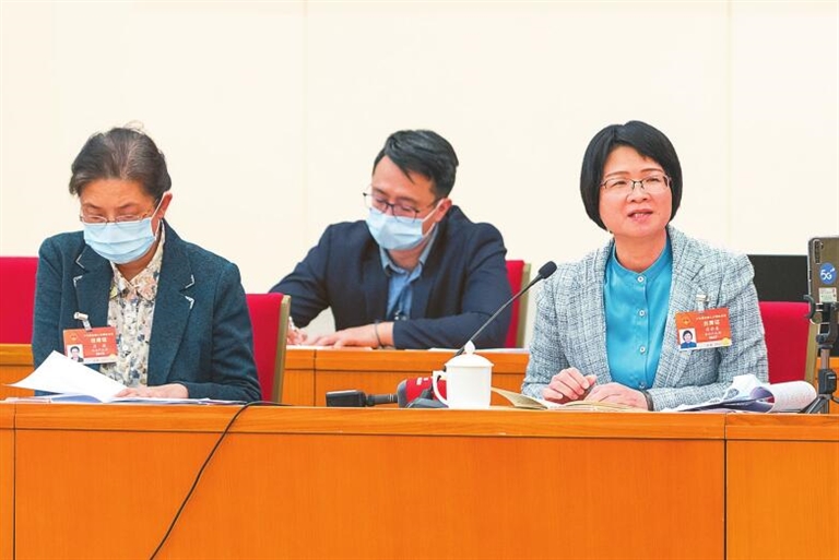 3月6日,出席十三届全国人大四次会议的海南代表团在住地举行全体会议,继续审议政府工作报告,审查“十四五”规划和2035年远景目标纲要草案。图为苻彩香代表(右一)在发言。本报特派记者 宋国强 摄