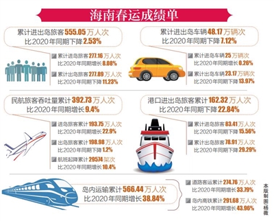 本报海口3月10日讯 (记者邵长春 通讯员潘彤彤)3月8日,为期40天的春运落下帷幕,海南日报记者3月10日从省交通运输厅获悉,今年春运是常态化疫情防控下的首个春运,受就地过年等因素影响,春运期间,全省累计进出岛旅客555.05万人次,比2020年同期下降2.53%;岛内交通运输则呈活跃态势,春运期间岛内运输累计566.44万人次,比2020年同期增长38.84%。