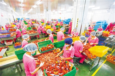万宁通过发放补贴帮扶企业稳岗留工,稳定就业。位于万宁的海南口味王科技发展有限公司采取“产业+就业”模式,帮助当地农村闲散劳动力实现就业。图为在该公司生产车间,工人在加工槟榔。本组图片由本报记者 袁琛 摄