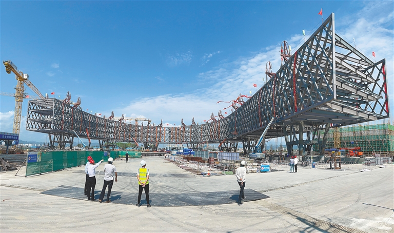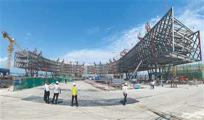 这是三亚崖州湾科技城深海科技创新公共平台(以下简称科创平台)的学术交流中心。它是国内首个U型大跨度双曲面斜交网格桁架,3月10日顺利完成结构封顶。年底建成后,作为我省科技产业发展的重大支撑项目,未来将重点建设成为国家深海科技创新公共平台,将满足涉海高校开展深海科技研发、科技成果转化等公共需求,打造成为深海科技高层次人才产学研的集聚地。