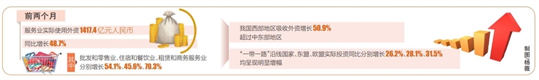 外商投资中国的信心从引资结构中也可见一斑:前两个月,服务业实际使用外资1417.4亿元人民币,同比增长48.7%,其中,批发和零售业、住宿和餐饮业、租赁和商务服务业分别增长54.1%、45.6%、70.3%。