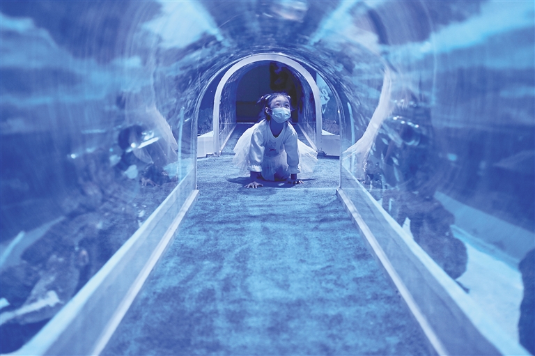 3月12日,在哈尔滨极地公园,小朋友在观赏海洋鱼类。