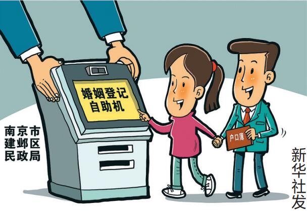 据新华社南京3月13日电 (记者沈汝发)新人通过选择“结婚登记”选项,依次完成身份确认、联网审查、扫描户口簿、信息录入、打印材料5个步骤,3分钟内就可完成结婚登记,4分钟内便可以从窗口领取结婚证。这是南京市建邺区民政局率先推出的婚姻登记自助服务。