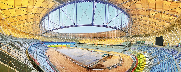 日前,三亚国际体育产业园体育场工程外立面膜全面完工,工人正在进行剩余的看台座椅、运动场施工。目前,三亚国际体育产业园体育场项目整体施工进度已完成98%。文/本报记者 徐慧玲 通讯员 耿雪 图/本报记者 封烁