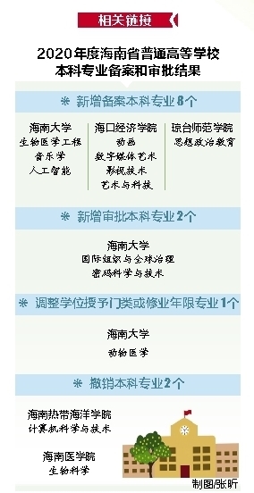 日前,教育部公布2020年度普通高等学校本科专业备案和审批结果,海南高校新增备案专业8个、审批专业2个,调整学位授予门类或修业年限专业1个,撤销专业2个。