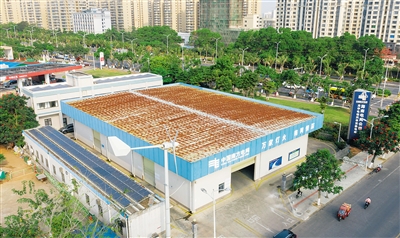 日前,俯瞰安装有光伏发电系统和风力发电机的海口龙华充电站。