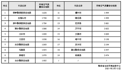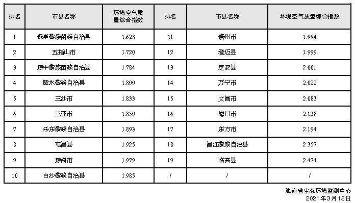 环境空气质量排名靠前的市县分别是保亭黎族苗族自治县、五指山市和琼中黎族苗族自治县,排名靠后的市县分别是临高县、昌江黎族自治县和东方市。2021年2月全省19个市县环境空气质量排名如下: