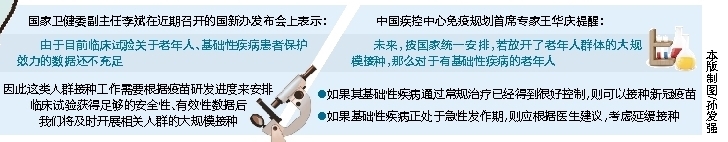 国家卫健委副主任李斌在近期召开的国新办发布会上表示,由于目前临床试验关于老年人、基础性疾病患者保护效力的数据还不充足,因此这类人群接种工作需要根据疫苗研发进度来安排,临床试验获得足够的安全性、有效性数据后,我们将及时开展相关人群的大规模接种。