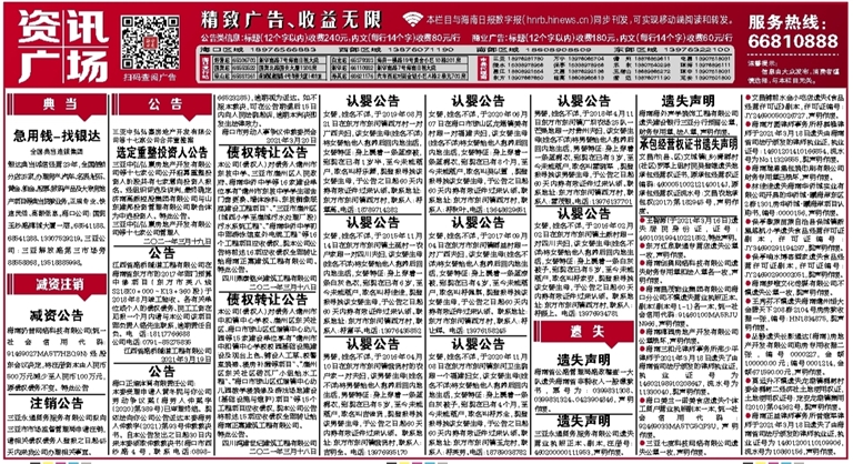 ●海南三和元律师事务所邢少平律师于2021年3月18日遗失了由海南省司法厅颁发的律师执业证,执业证号为14602198910208647,流水号为11330040,现声明作废。