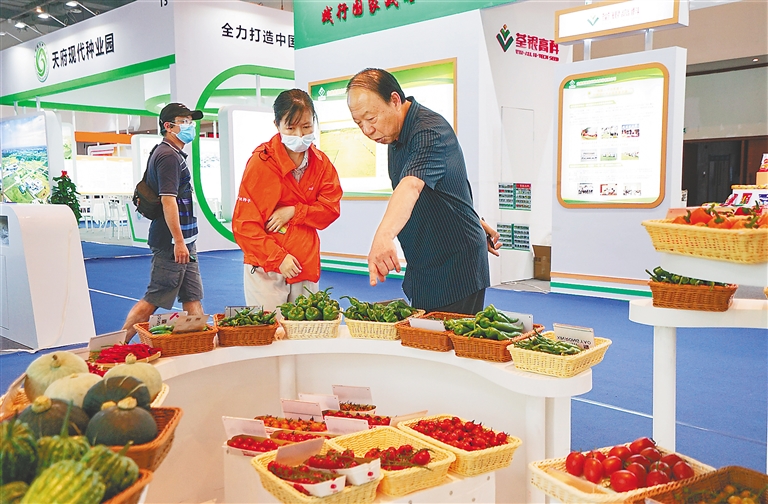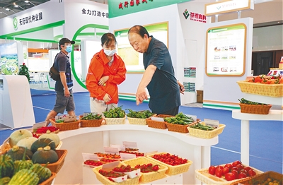 3月20日,2021中国种子大会暨南繁硅谷论坛在三亚开幕,与会嘉宾在展馆参观展示柜台。 本报记者 武威 摄