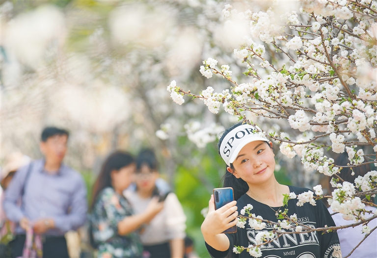 图为3月21日,游客在海口长影环球100奇幻乐园盛开的樱花树下自拍。