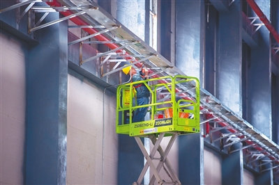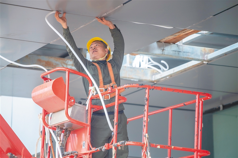 3月22日,在海口美兰空港一站式飞机维修基地项目施工现场,建设者在立体库进行接线作业。目前,该项目已进入室内装饰收尾阶段,将于月底启动验收工作,6月之前完成整个项目的竣工验收。