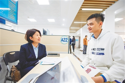 3月23日,省人力资源开发局(省就业局)一楼公共服务大厅举办公益招聘会。图为应聘者与用人单位工作人员在交流。