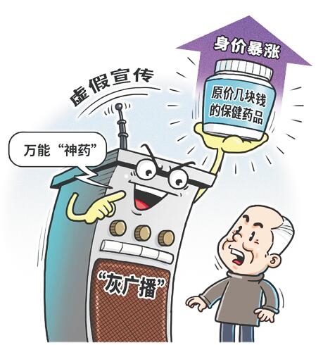 “我们在生产地了解到,一盒药在当地药店仅卖几块钱,但到‘灰广播’上走一遭便身价暴涨,一盒售价88元,而且必须一次性购买一个疗程,最少12盒起卖。”北京市检四分院第四检察部检察官助理樊士诚表示,一家在“灰广播”上销售保健品的公司,2至3年内的流水甚至过亿元。