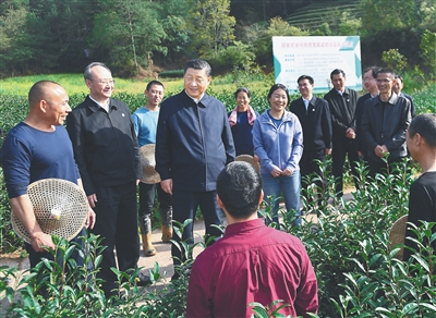 武夷山是乌龙茶、红茶的发源地。习近平来到星村镇燕子窠生态茶园,察看春茶长势,了解当地茶产业发展情况。习近平强调,要统筹做好茶文化、茶产业、茶科技这篇大文章,坚持绿色发展方向,强化品牌意识,优化营销流通环境,打牢乡村振兴的产业基础。要深入推进科技特派员制度,让广大科技特派员把论文写在田野大地上。