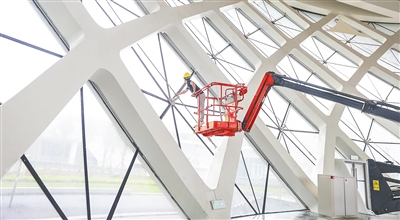 3月25日,在海南国际会展中心二期项目展馆,工人在加紧施工,扮靓展馆。