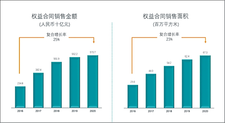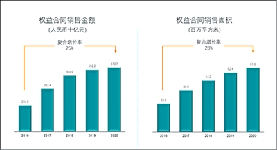 2020年,面对疫情带来的严峻挑战,碧桂园及时把握城市轮动复苏机遇,打造适销产品,加大营销力度,推出线上营销等创新措施,实现了规模稳步增长,全年累计实现归属公司股东权益的合同销售金额约5706.6亿元,较2019年同比增加3.3%;归属公司股东权益的合同销售建筑面积约6733万平方米,较2019年同比增加8%。统计显示,2016年至2020年期间,公司权益合同销售金额复合增长率达到25%。
