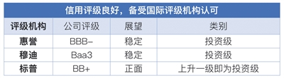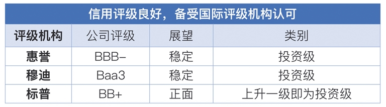 截至目前,穆迪、惠誉两家国际评级机构已给予公司“投资级”评定,标普主体评级展望为正面,离“投资级”仅一步之遥,公司已成为罕有的同时获得穆迪和惠誉两家机构“投资级”评级的民营房地产上市公司。