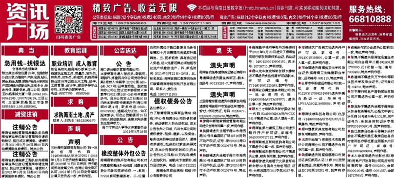 为了理清海南全库商品调剂(网络)中心有限责任公司的债权债务,保证债权人的合法权益,在本公告发布之日前,凡与全库公司的债权债务、担保、借款、以及资金、账务往来的单位或者自然人,请持有效债权、担保和付款往来等凭证,在本公告规定的时间内(自本公告刊出之日起30天内)向债务人主张权利。逾期未予追索的,视为自动放弃。电话:14610122222