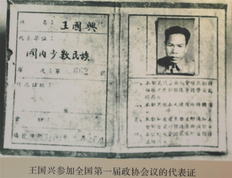“少数民族向来被统治者认为做苦工、出钱、出粮、做奴隶是‘够资格’的,但参与讨论国家大事是没有份的,今天不同了,共产党不但分给我们天地,同时也分给我们参与讨论国家大事的权利了。我们只有永远跟着共产党走,跟着毛主席走,我们的一切权利,才会得到保障;我们的前途,才会光明灿烂……”1949年9月27日下午,北京中南海怀仁堂,海南黎族领袖王国兴站在讲台前,用海南方言作了一段简短发言,经由其秘书冯子平翻译成普通话后,赢得台下掌声雷动。
