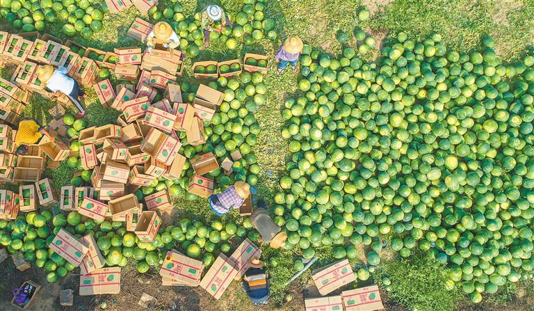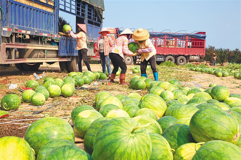 “今年这瓜可是大丰收,麒麟西瓜田头价达到4.8元/斤,比2019年3.8元/斤的高价还高出1元!”3月24日,在万宁市东澳镇大奶洋一片硕果累累的瓜田里,刚刚采摘下的西瓜被工人们手脚麻利地送到仓储区,经专人打包后,送上早早等候在一旁的大货车。一片忙碌景象中,万宁腾翔瓜菜种植专业合作社负责人吴志辉的脸上满是喜色。这些品相优、质量好的西瓜将通过物流网络送到全国各地的消费者手中。
