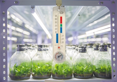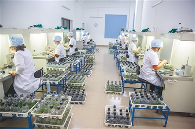 走进兰花育苗基地,与想象中兰花盛开的景象不同,这里更像是一间高科技的实验室,一株株幼小的兰花苗经技术切割后,被植入干净无毒的玻璃瓶中。培育兰花苗的房间保持恒温恒湿,培育技术人员个个穿着白大褂,戴着帽子和口罩。