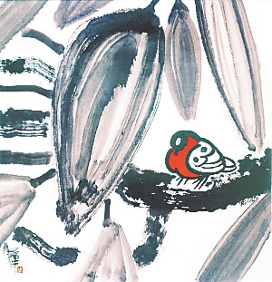 《打盹的小鸟》(国画)