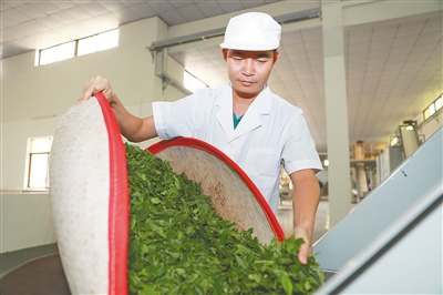 在清洁的车间里,加工人员将分级后的茶青均匀地摊放在摊青槽上,这也是茶叶加工的第一道工序摊青。“本着嫩叶薄摊,老叶厚摊的原则,制作绿茶需摊青3至5小时,红茶一般是12至16个小时。”杜成林说,有效的摊青能让茶叶的青草气缓慢散发,酶活性增强,部分蛋白质水解为氨基酸,淀粉水解为可溶性糖,有利于成品茶品质的提高,这也为接下来的杀青工序做好了铺垫。