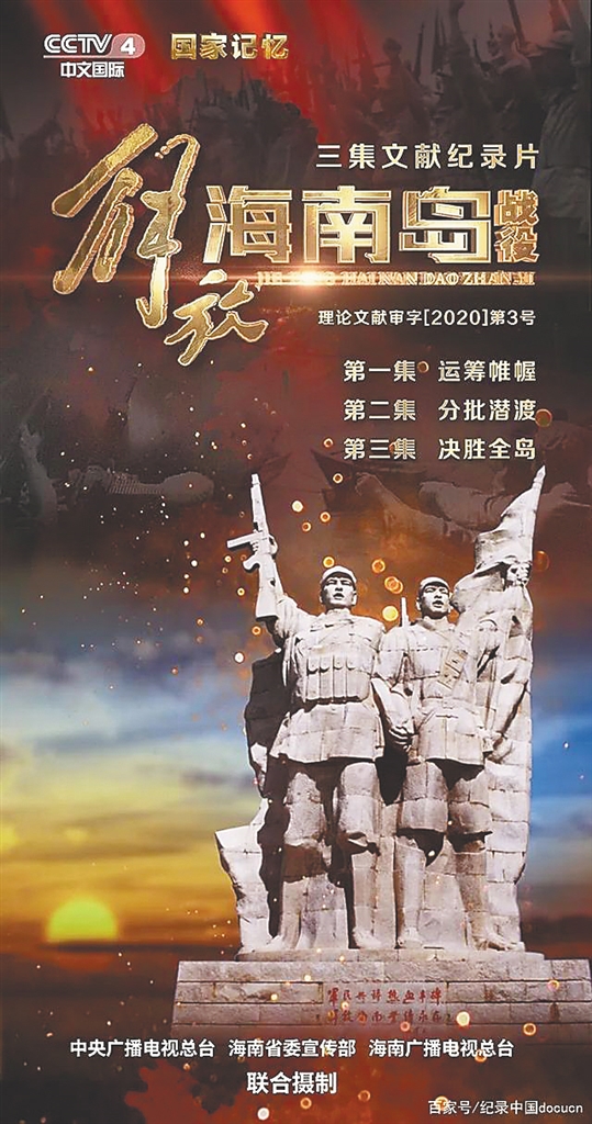 解放海南岛作为中共历史上的经典海战,在我国军事史上具有重要意义,一向为史料大书特书,海南题材纪录片也是从《大战海南岛》拉开帷幕的。为纪念解放海南岛70周年,中央广播电视总台、海南省委宣传部、海南广播电视总台联合摄制了3集文献纪录片《解放海南岛战役》,于2020年5月25日起在央视《国家记忆》栏目播出,反响强烈。该作品由《运筹帷幄》《分批潜渡》《决胜全岛》构成,将历史影像和现场寻访结合起来,将历史文献和亲历者访谈结合起来,既留存了历史,也彰显了红色精神,传播效果很好。
