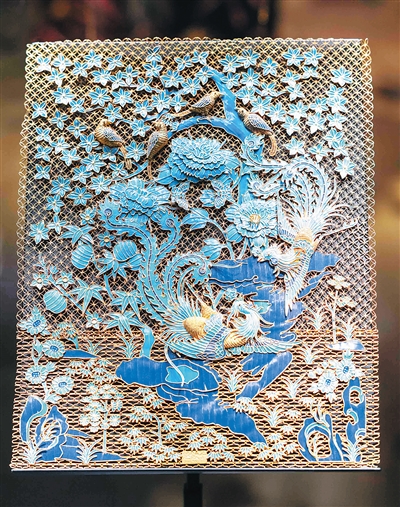 绝版作品《点翠凤凰图》更是令人目不转睛。据悉,该作品原版为纸质点翠图,此幅作品则运用花丝镶嵌堆垒的技术在上面层层叠加,底图由花丝编织,上边为点翠艺术,即把翠鸟绿中闪蓝的羽毛贴在花丝的空白点上,拼成神鸟凤凰的形状,足以显示设计师的创意与艺术。