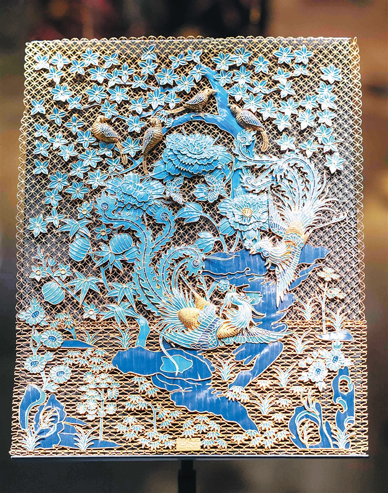 走进花丝镶嵌国家非物质文化遗产楚釹子品牌艺术珍品展,86件展品映衬得整个展厅金光闪闪,富丽堂皇。驻足细赏,《佛旨纶音》《腾鸾金凤》等作品让人不禁感叹中国工艺的极致之美。