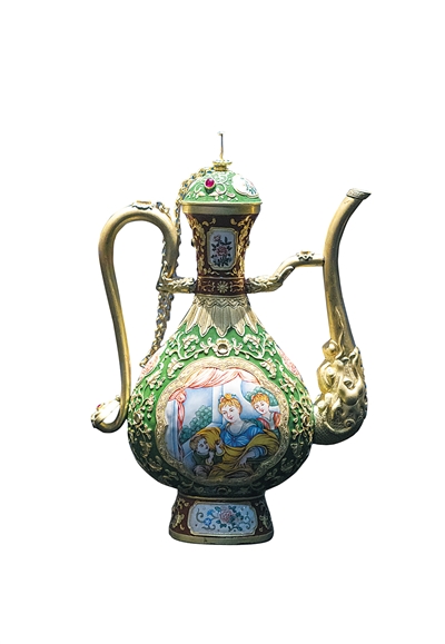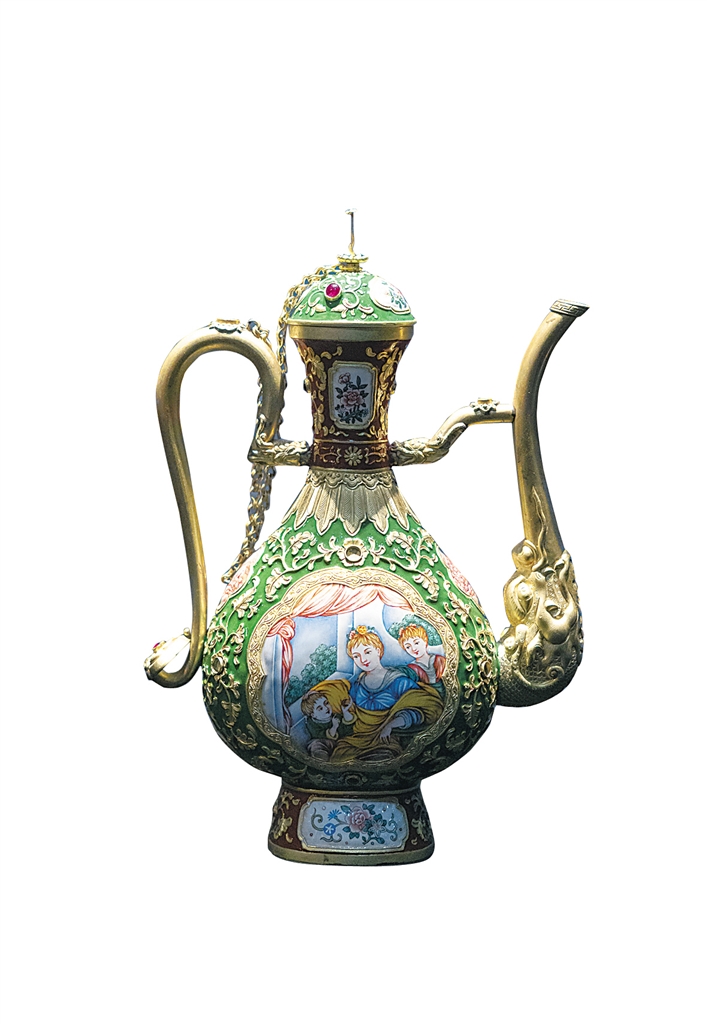 《珐琅彩提梁壶》以黄金铸就,配合珐琅彩,相辅相成,尽显用心,而壶身又增添了西方油画技巧,于富贵高雅中增添别样情趣。《盘龙瓶》瓶重达653克,周身皆用花丝工艺打造而成,其手法精细,更体现在以盘龙之形编于瓶周,宝石的镶嵌更显绝美,实现花丝镶嵌技艺与中华古老文化完美交织结合。