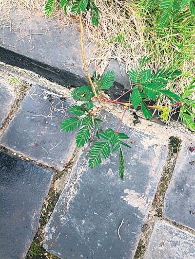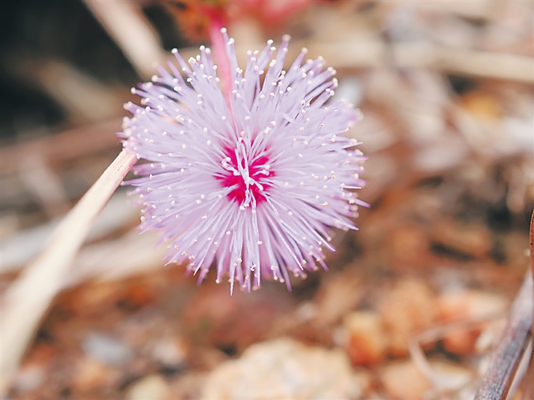 人们常见触碰叶片会闭合的含羞草本种,属于豆科含羞草属植物。松鼠学堂自然教育工作室自然教育导师春香说,这种含羞草一般长在草地里,植株不大,生命力顽强,细细的茎上长有锐刺。