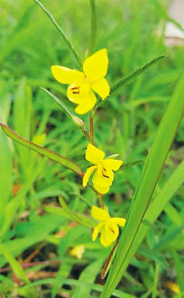 含羞草决明,属于豆科决明属的植物。它的叶子也是成对的,细细长长,顶端有些锋利,颇似镰刀。花瓣呈黄色,中间的花药是一根细长细长的柱子。这一植物本种常生长于荒地上,耐旱又耐瘠,是良好的覆盖植物和改土植物,同时又是良好的绿肥,其幼嫩茎叶可以代茶。