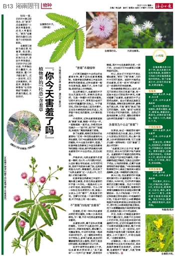 除了含羞草,海南还有其他的含羞草吗?“还有一种巴西含羞草和光荚含羞草,它们与含羞草是同科同属的植物,叶片也是羽状复叶,很美。”松鼠学堂自然教育工作室自然教育导师春香介绍说,被外界刺激后光荚含羞草的叶片也会闭合,反应比较慢。