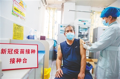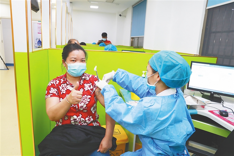 3月29日,在海口市龙华区城西镇金盘第一社区卫生服务站,市民在接种新冠疫苗。本报记者 袁琛 摄