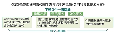 “但《指南》只是一个参考,毕竟不同生态系统的结构和功能存在差异,可提供的产品与服务功能也有区别,譬如海南热带雨林国家公园便无法提供海岸防护供给。”陈宗铸透露,结合热带雨林自身特点,最终《海南热带雨林国家公园生态系统生产总值(GEP)核算技术方案》(以下简称《技术方案》)设置了3个一级指标、19个二级指标,重点突出水源涵养、生物多样性、科研教育等服务功能。