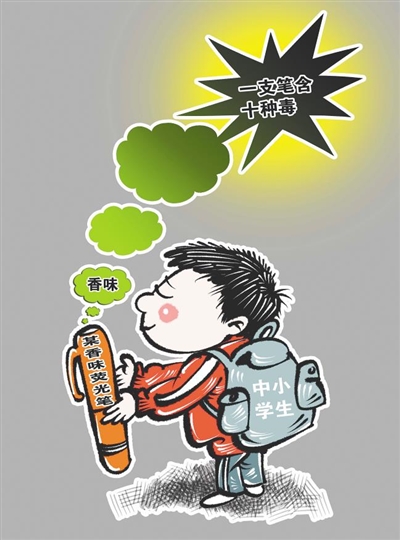 中国科学院合肥物质科学研究院曾对市场上深受中小学生喜欢的4个品牌香味荧光笔拆解部件逐个检测分析,发现挥发性气味来自荧光笔内的墨水,一共检测出15种挥发成分,其中10种为有毒物质,还包括高毒物质丙烯腈。研究显示,长时间吸入丙烯腈能引起恶心、呕吐、头痛、疲倦等症状。