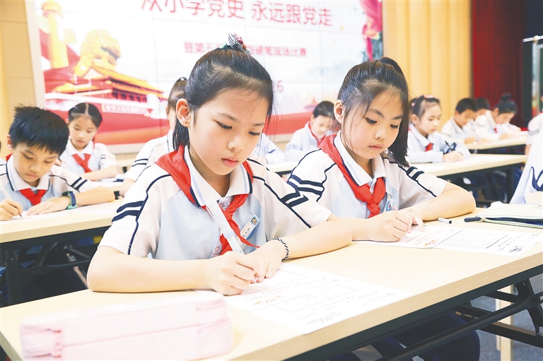 “此前,孩子们抒写过自己对于生态文明建设、海南自由贸易港建设等多个主题的理解和认识,寓教于乐,效果很好。学校此次在设计党史学习教育系列活动时,希望能好好利用书法校本课程这个学习平台。”吴小贝说,汉字是世界上最具有造型感的文字。在此次书法比赛中,孩子们展示的不仅是自己的书法水平,也融入了爱党爱国的情感和精神。