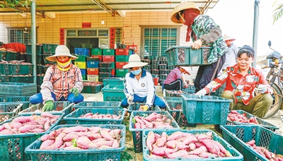 3月30日,在澄迈县桥头镇沙土村,村民正在将采收来的地瓜分拣装筐,准备运输到各地销售。当下,正值澄迈桥头地瓜收获季。桥头富硒地瓜一直深受广大消费者喜爱,产品远销日本、加拿大以及北京、上海、广州、香港等地。