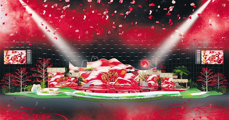 舞美设计以“花开三月三”为创作理念,融合木棉、梯田、雨林、船型屋、溪流等具有海南和民族特色的舞台制景,通过现代声光电科技手段,打造耳目一新的微实景演出舞台。