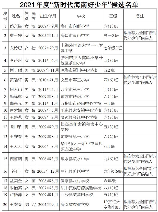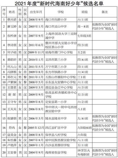经过学生自荐、学校筛选、市县择优推荐,省文明办、省教育厅、团省委、省妇联、省关工委联合评选,评出2021年度“新时代海南好少年”候选人20名(其中推荐5名全国“新时代好少年”候选人),现将候选名单向社会公示,接受群众监督。