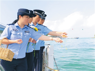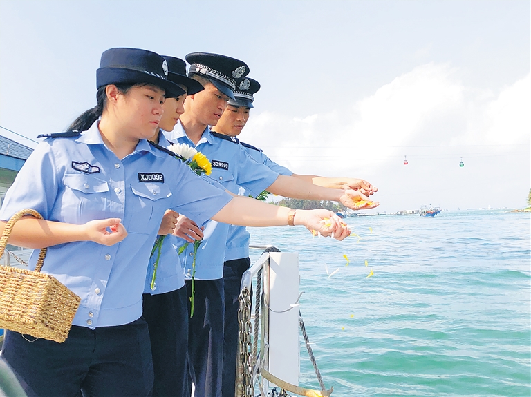 近期,省公安厅海岸警察总队第四支队组织三亚港、港门、新村港海岸派出所民警乘坐公安执法艇分别在三亚港、崖州中心渔港、陵水疍家渔排外海域,举行海上纪念英烈活动。民警们在船艇甲板上手捧菊花,肃立默哀,伴随3声船笛声响起,民警缓缓地捧起花瓣,撒向大海。