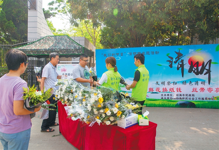 为倡导市民不焚烧、抛撒香蜡和纸钱,不污染破坏公共环境,以环保、节约、低碳的文明方式缅怀逝者,琼海市已连续3年开展纸钱换鲜花活动。