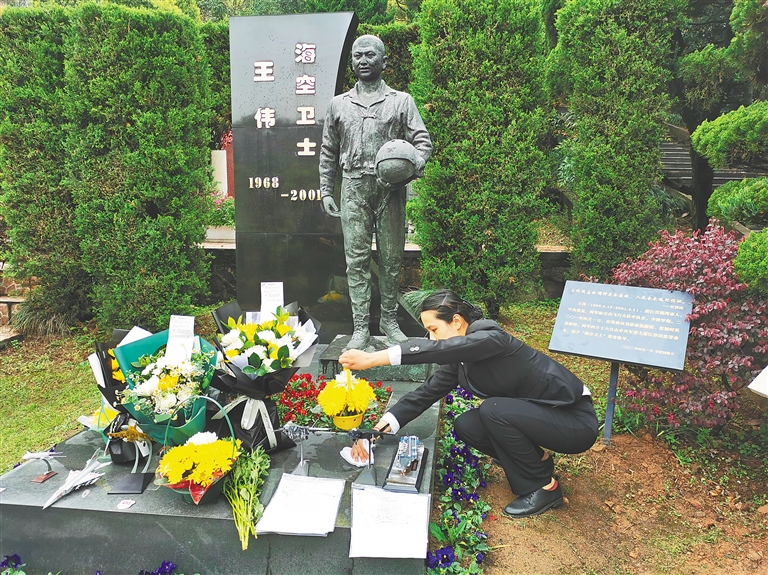 在杭州东北郊的安贤陵园里,安放着王伟烈士穿过的一套老式海军军装,一尊“海空卫士”王伟烈士的全身铜像凌然矗立。20年了,两代海军军人在苍松簇拥下隔空相见。