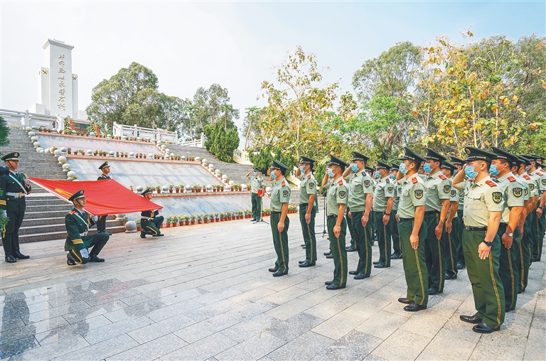 4月2日,武警三亚支队官兵在三亚梅山老区革命烈士陵园开展祭扫活动。 本报记者 武威 摄